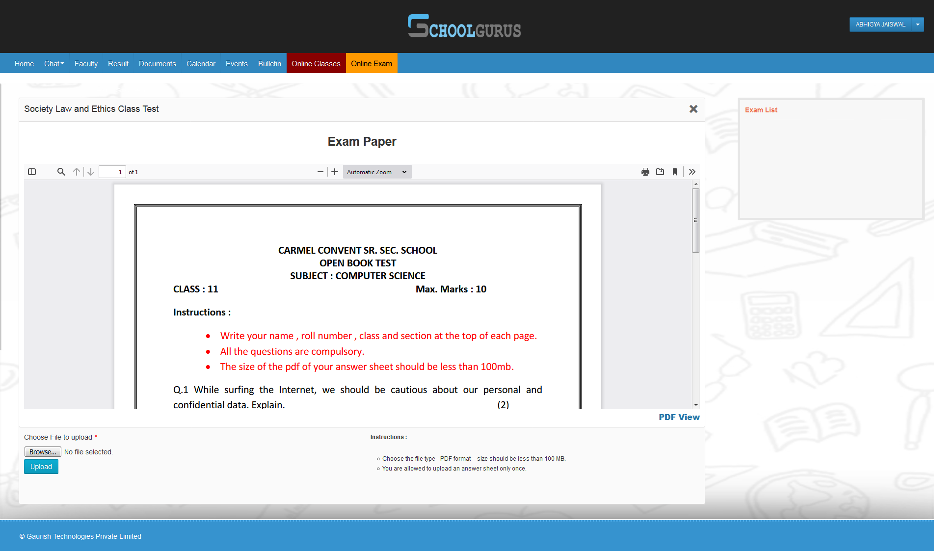 School Gurus (SG) application has the feature for Online Exam. A teacher/admin can upload the exam paper in PDF format, also can lock/unlock the paper and answer sheet.Student can see and download the paper, and in the given time period (till the answer sheet upload is unlock), the student can upload the answer sheet in the SG Application.